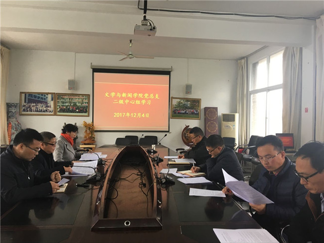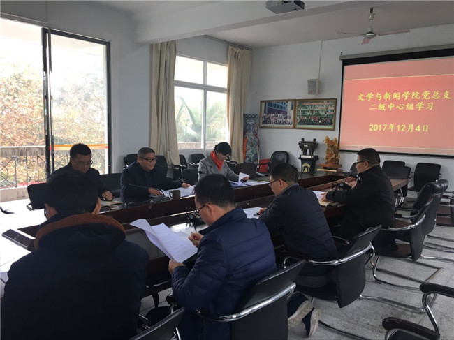 为深入贯彻落实党的十九大精神,2017年12月4日,文新学院组织中心组全体成员学习习近平习近平新时代中国特色社会主义思想,会议由学院党总支书记熊泽文主持,学院院长任志萍、党总支副书记胡平建、学院副院长何晓苇、纪检委员刘传启、宣传委员杨晓军以及学院办公室主任杨林参加了此次会议。