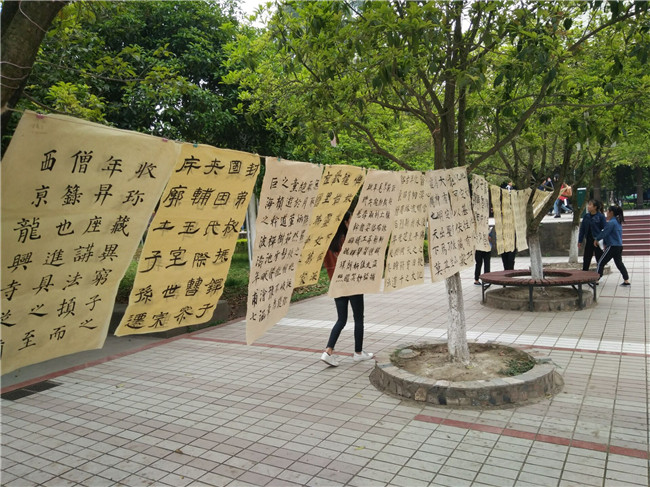 文字是传统文化的载体,为传承弘扬这一优秀的传统文化,加深我校大学生对文字的理解,2018年3月29日文新学院学生分会学科部在桂花广场进行了为期三天的优秀书法作品展示。此次展览作品均来自于文新学院2016、2017级学生的优秀寒假作业。