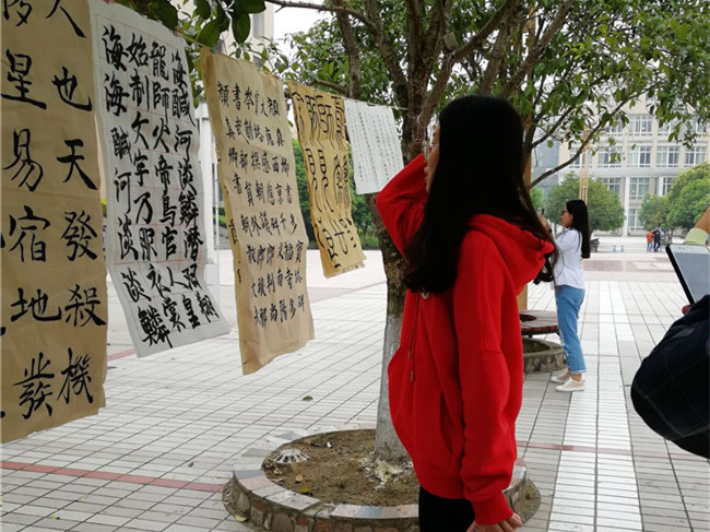 展出三日以来,路过的同学都会被这一独特的景致吸引,纷纷驻足欣赏,赞美惊叹声不断,这充分展示了文新学子深厚的笔墨功底和文化底蕴。此次书法作品展反响强烈,参观人数高达3000多人次。同时,我院为鼓励同学们认真学习书法,对杨钊、邱欣悦、刘倩等20名同学进行了奖励。