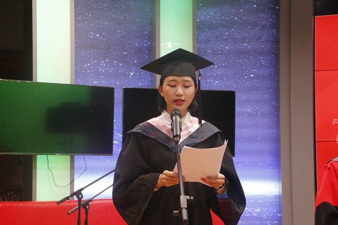毕业典礼在慷慨激昂的《国歌》声中拉开序幕,随后,熊泽文致辞,为全体毕业生送上祝福,并提出几点建议:希望全体毕业生建构积极向上的阳光心态,不断积累智慧和力量;自强不息,不要为暂时的挫折放弃自己的理想,不要为蝇头小利而甘于平庸;善待他人,善待自己,靠自己的工作态度和能力光明正大地赢得他人的肯定和尊重。接着,教师代表邓帮云和王钊熠用风趣幽默的语言进行了发言,希望大家永远保持一颗年轻的心,珍惜大学当中的感情,尊重自己的每一个选择,常回母校看看。随后,毕业生代表刘艺梅发言,她说到,文新学院给了大家太多珍贵的记忆,行知楼前的郎朗书声、实训楼里的播报训练、博雅楼中忙碌的身影、图书馆外绿了又黄的树叶、还有学院领导老师的日夜陪伴。文新不仅让全体毕业生们学到了知识,而且学会了怎样做人,做一个诚实、勤奋、勇敢的人,这是文新带给大家永恒的精神财富。