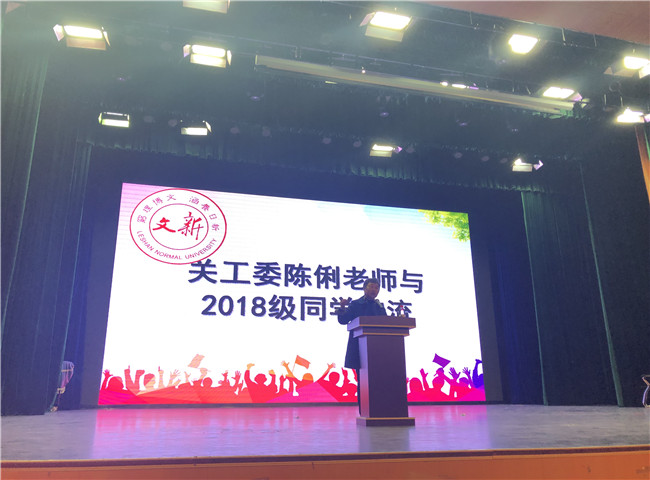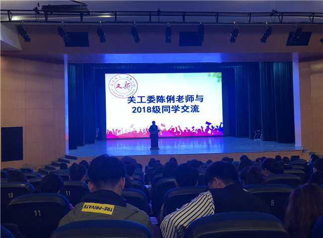 2018年10月21日晚8点,文新学院邀请关工委陈俐老师在实训楼多功能厅与2018级新生全体学生进行了有关“校训背后的故事与大学学习生活”的交流。交流会由18级辅导员曾晶主持,16级辅导员王耀出席,18级全体新生参加了本次交流会。