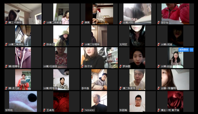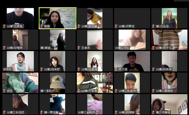 2月23日,18级辅导员曾晶分批召开网络年级大会后,在24日18级全体学生积极投入网络课程的学习中。24日上午,18级全体播主班于网络会议平台,开始了网络晨练。周一至周五上午7:20-7:50是播主专业的晨练时间,顶着睡眼惺忪,克服对邻里间清晨的打扰,7点20分,18级播主班全体同学准时出现在网络会议平台中。