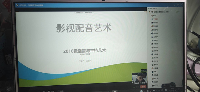支好直播话筒,开启摄像头,王立元老师就开始了他的《影视配音艺术》课程的网上直播。课堂上,王老师仔细讲解着配音设备分类、不同话筒适合的音色、调音台使用等知识点。屏幕后面,28名大二学生通过QQ群网络进行学习,并不时与老师交流互动。