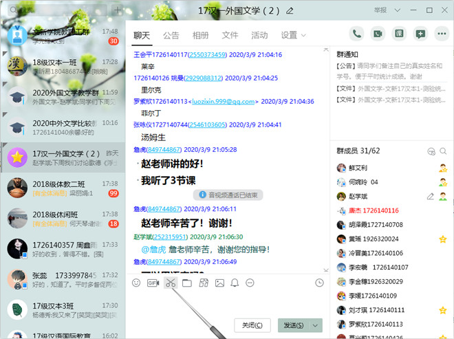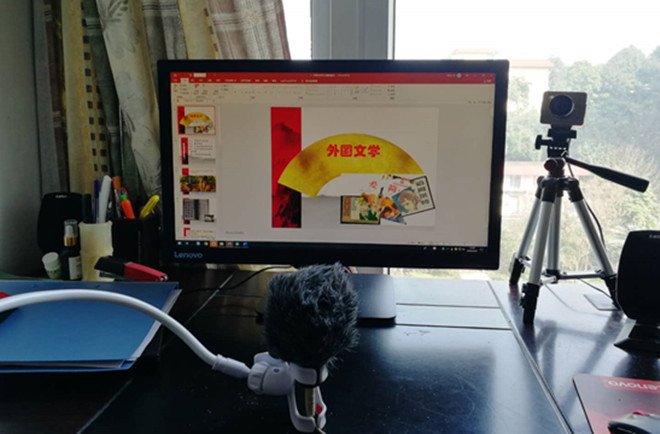 我的课程主要是通过QQ群视频直播和超星学习通相结合授课。开学前通过网络购置了较清晰的教学摄像头、话筒等。学习通上现在大致建设好了一门《中外文学比较》的在线课程,上传有教学大纲,教学计划、教学课件、慕课视频、电子教材等内容,每次上课时间打卡和进行小测验。我本期的外国文学、中外文学比较、西方文学名著名片欣赏等课都建立了QQ群,群内上传有教学计划、教学大纲、教案、教学课件、名著名片等电子资源。为了弥补超星学习通的不足,进一步督促同学主动学习,近三周同时进行了QQ直播授课。17汉本、国教、18级语教班的同学们反映视频声音画面清晰完整,互动中也得到同学的积极回应,教学效果受到肯定。