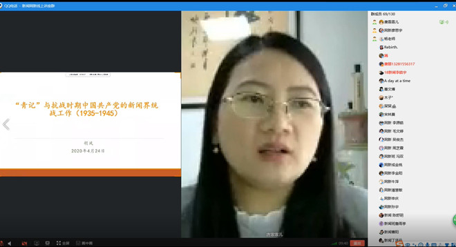 本网讯(文、图/杨晓军)4月24日下午14:30,安徽省社科院副研究员,中国科学技术大学在站博士后胡凤老师受邀通过线上直播方式做了主题为“1935年至1945年间‘青记’与抗战时期中国共产党的新闻界统战工作”的讲座。新闻学和网络新媒体专业一百余名同学参加了讲座。