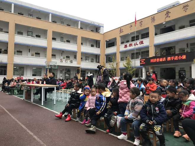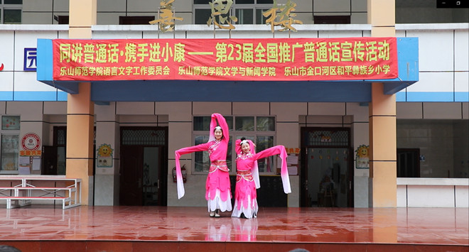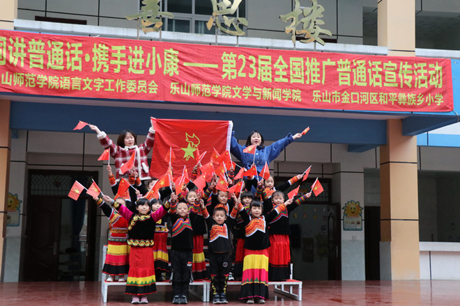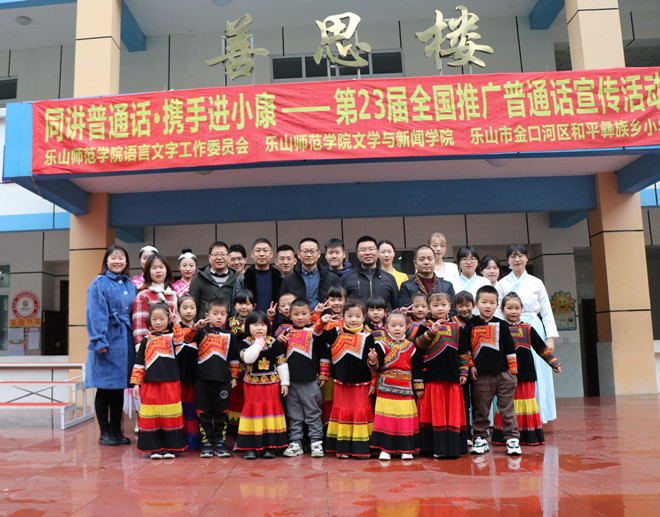 本网讯(文、图/王泓竣)12月4日上午,由乐山师范学院语言文字工作委员会主办、乐山师范学院文学与新闻学院承办的以“同讲普通话,携手进小康”为主题的第23届全国普通话推广宣传周活动在乐山市金口河区和平彝族乡小学顺利举行。出席此次活动的领导有:文学与新闻学院党总支副书记胡平建、金口河教育局副局长先云仲、教育股股长胡红军和文学与新闻学院分团委书记资飞。