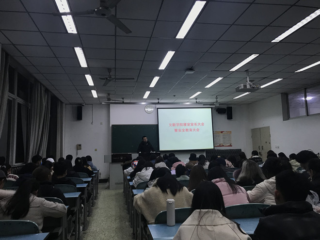本网讯(文、图/资飞)为营造良好的寝室学习生活氛围,构建平安健康快乐的学生成长环境,11月29日晚上,文新学院在行知楼109教室组织召开了寝室室长大会暨安全教育大会。此次会议由文新学院分团委书记资飞主持,特邀党总支副书记胡平建主讲。文新学院19级、20级全体寝室长100余人参加了此次会议。