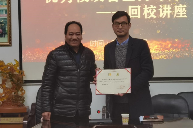 最后,我院党总书记杨泽勇为曹圣涛颁发聘书,特聘曹圣涛为乐山师范学院校友导师团成员,他表示将会继续为学弟学妹们的学习生涯作出贡献。