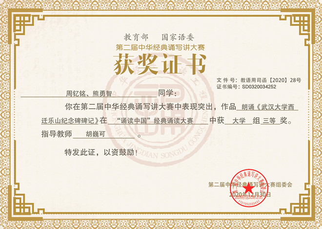 本网讯(文、图/胡巍可)2020年6至12月,根据《教育部办公厅关于举办第二届中华经典诵写讲大赛的通知》(教语用厅函〔2020〕1号)精神,乐山师范学院各级领导高度重视,由文学与新闻学院牵头组织参与由教育部、国家语委共同主办的第二届中华经典诵写讲大赛“诵读中国”大学生组节目竞赛。川内初选阶段,大学生组朗诵类作品超200余件,川内决赛中共有25个作品获得等级奖。各省前15名的作品入围全国决赛,我校作品与全国34个省区市共有2500余件大学生组朗诵类作品共同竞争国奖,成为入围全国复赛的大学生组作品450件的其中之一。最终,四川省仅有3件作品获奖。我校播音与主持艺术专业的周钇铭、熊勇智同学在胡巍可老师的指导下创作的《武汉大学西迁乐山纪念碑碑记》朗诵作品斩获全国三等奖,与川师、川影比肩成为连续斩获该赛事的全国奖的四川高校。