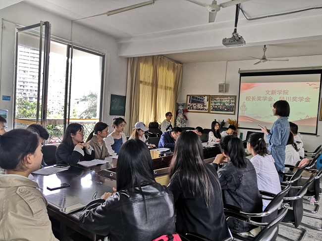 根据文新学院2021年度“校长奖学金”“陆川奖学金”评选工作部署,4月28日中午,18级辅导员蔡光军在学院会议室组织18级参评学生召开2021年度“校长奖学金”“陆川奖学金”评选会。此次评选会邀请了学院党总支副书记胡平建、19级辅导员资飞、实习辅导员朱婷婷以及18、19级学生代表进行评选监督。