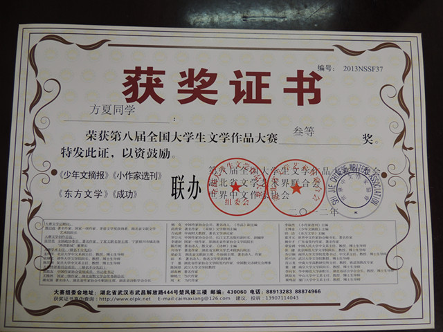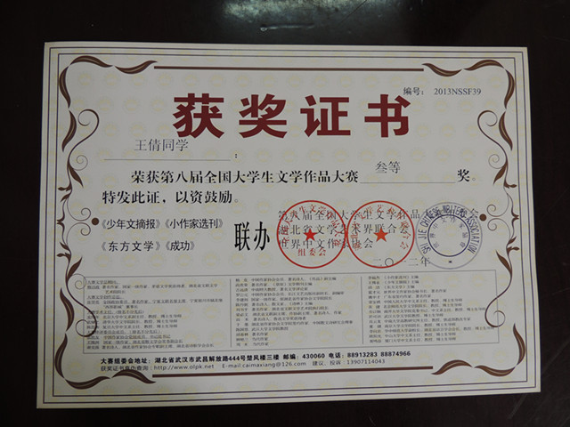 近日,我院学生在参加“第八届全国大学生文学作品大赛”中喜获佳绩,此项赛事是由湖北省文学艺术界联合会、中文作家协会、《小作家选刊》、《少年文摘报》、《东方文学》及国内知名学府共同举办的每年一届的全国性大学生文学创作赛事,大赛由湖北省文联文学艺术院主办,邀请全国重点院校协办。文新学院张昭兵博士组织、指导读写会的同学积极参加,选送参赛作品46份,其中潘忠莹、黄丽莉、刘骁军获一等奖,另有6个作品获二等奖,29个作品获三等奖,6个作品获优秀奖,我院将择日举行参赛作品品析会。